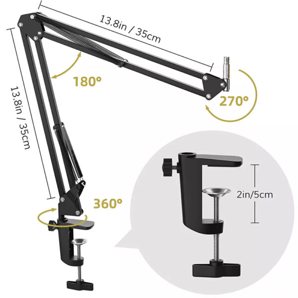 - 🎤 [DESK CLAMP]: – The desk clamp easily clips to any desk up to 5cm thickness. Standard 3/8″ to 5/8″ adapter for different shock mounts and microphones included. (Note: The microphone and other accessories not included included.
