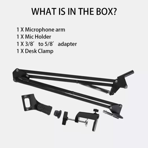 - 🎤[WHAT YOU GET]: – 1 x Microphone Arm, 1 x 3/8″ to 5/8″ Adapter, 1 x Desk Clamp, 1 x Mic Holder
