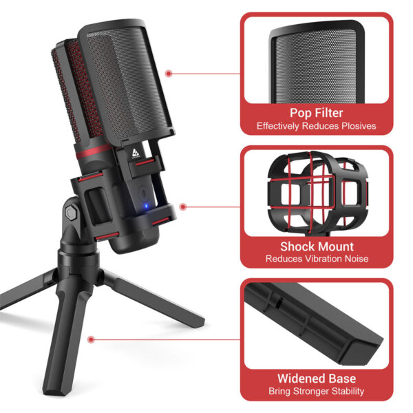 | 馃帳POP FILTER, SHOCK MOUNT & TRIPOD INCLUDED – No need to buy extra accessories. This audio recording mic comes with a compatible pop filter & shock mount. It helps to reduce the pops and will keep your audience from being distracted by the harsher sounds. The shock mount isolates physical vibration coming from the floor, desk, and stand effectively reducing noise in your recording. It also comes with a sturdy foldable metal & ABS tripod stand with a maximum height of 23 cm (including the microphone) |