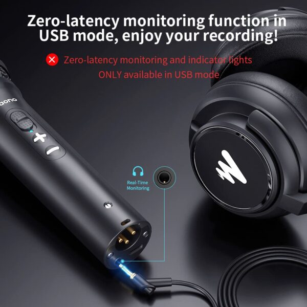 - Monitor Volume Control: The handheld microphone also has a control button that can adjust the headphone output volume conveniently. (Monitoring and volume control only work under USB mode)