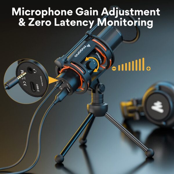 MAONO AU-PM471TS Condenser USB Microphone for PC, with Metal Pop Filter, Tripod, Gain Knob & 0-Latency Monitoring for YouTube, Podcasting, Streaming