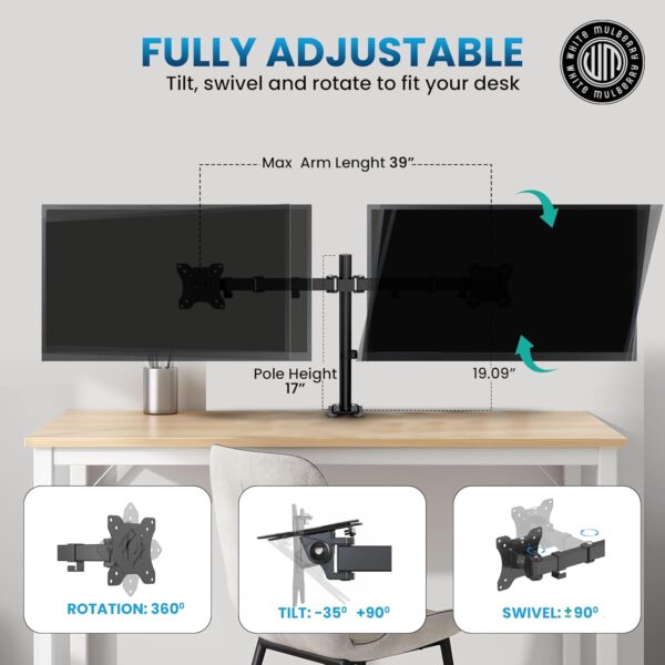 - Fully Adjustable: Both monitor arm mounts have 360°rotation, ±90° tilt functions and 180° swivel to adjust the monitor’s screen. It conveniently sets your monitors at an optimal angle to increase comfort, posture, relieving strain on the neck & shoulders while increasing productivity levels.